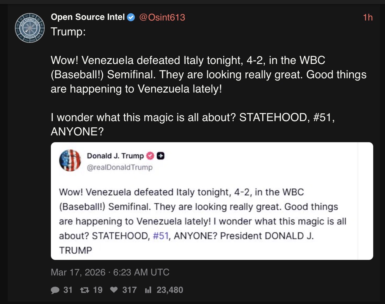 So at the end it was just a echo chamber full of demoralized deviants and not very interesting, people will bash X for many things but one thing is for certain and this is something I had to learn too recently, unlike with Facebook that I deleted many moons ago and never returned with X i had no choice but to once again remake a new account because is the only place where I can get updated on the news as they are happening, for example the current events happening with the US and Venezuela as as you know i'm very interested about in the posibility to return to my home country, enjoy the daily explosion videos of the Iran war, people making fun of libtards, bashing anime tourists and gatekeeping them to death, enjoying a lot of dolls frontline posts, and many other interesting topics.
